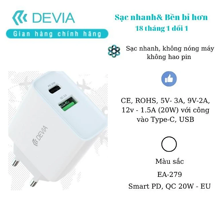 Củ sạc nhanh Devia Smart PD+ QC chuẩn EU 20W- hàng chính hãng