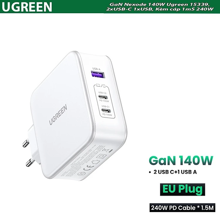 - Củ sạc nhanh GaN Nexode 140W Ugreen 15339 là thiết bị tối ưu để cung cấp năng lượng cho các thiết bị di động của bạn, đặt biệt là MacBook Pro Ugreen 15339 giúp tăng mức sạc lên 140W. Sạc MacBook Pro 16” lên 70% trong 60 phút, Củ sạc nhanh Ugreen 3 trong 1 bao gồm hai cổng USB-C và một cổng USB-A hỗ trợ sạc đồng thời hai máy tính xách tay và điện thoại ở tốc độ siêu nhanh, cần thiết cho người dùng công nghệ sử dụng nhiều thiết bị. Đi kèm dây sạc nhanh Type-C to C 5FT 240W.