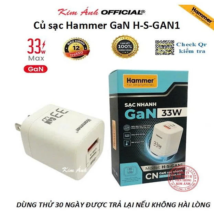 Củ sạc nhanh Ham.mer GaN ( H-S-GAN1) công suất 33W có 2 cổng sạc USB + C , Check Qr hàng chính hãng bảo hành 1 năm