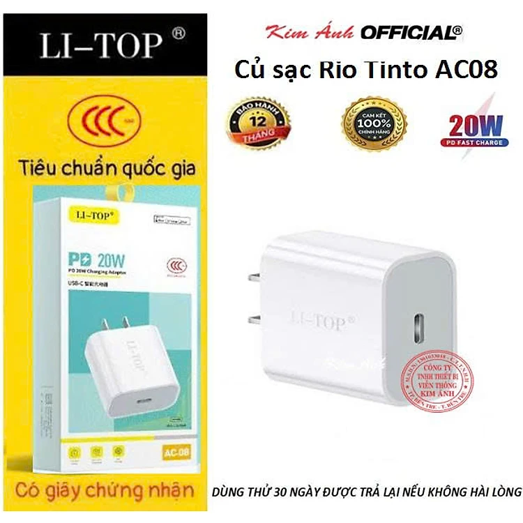 Củ sạc nhanh LI-TOP AC08, PD 20W, đạt chứng nhận 3C tiêu chuẩn quốc gia về an toàn thiêt bị điện, hàng chính hãng bảo hành 12 tháng