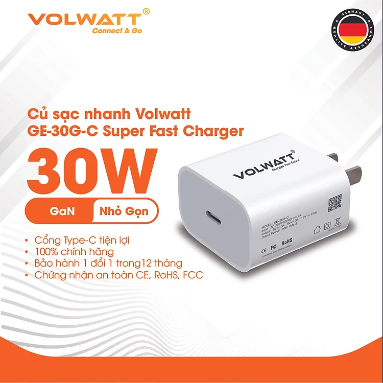 Củ sạc nhanh Volwatt GE-30G-C Super Fast Charger dùng cho iPhone/ Samsung/ OPPO... (30W, Type C, PD/ QC3.0 Quick charger) - Hàng chính hãng - Bảo hành 12 tháng