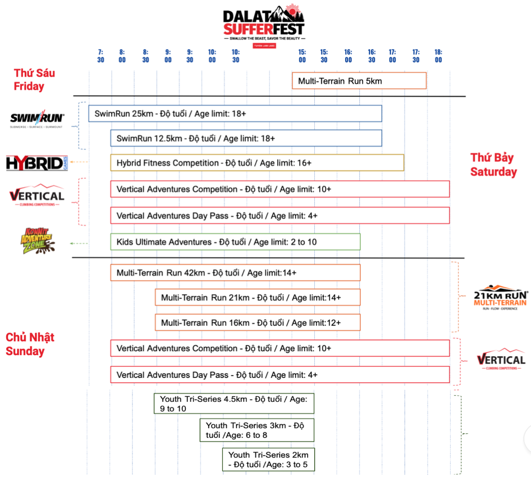 SufferFest là một sự kiện thể thao cao cấp hội tụ nhiều loại hình thi đấu khác nhau hấp dẫn nhất Việt Nam. Mỗi cuộc thi của SufferFest đều được tổ chức và công nhận độc lập với những giá trị giải thưởng khác nhau. Bạn có thể đăng ký một (1) hoặc nhiều cuộc đua trong suốt tuần lễ SufferFest, nơi mà đem đến cho bạn những trải nghiệm thể thao độc nhất vô nhị tại địa điểm thiên nhiên lý tưởng ở Vietnam.