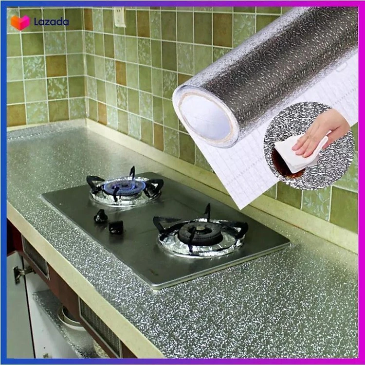Cuộn 2m decal giấy dán bếp tráng nhôm cách nhiệt ô vuông bạc khổ 60cm keo sẵn dễ dàng lau chùi. Decor