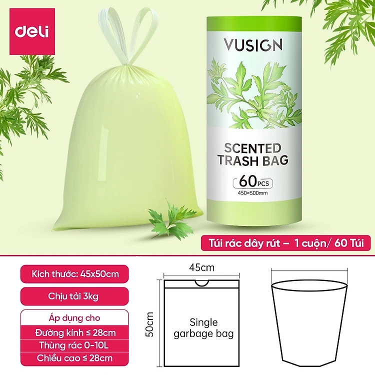 Cuộn 60 Túi Đựng Rác Dây Rút Hương DelixVusign Chống Côn Trùng Dày Dặn, Dai, Không Rò Rỉ Chống Rách cho thùng rác