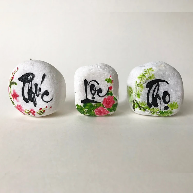 Bộ 3 viên đá Phúc Lộc Thọ. Đá Thư Pháp tự nhiên, viết vẽ thủ công, do nghệ nhân Quang Lĩnh thực hiện. Những câu thư, từ ngữ có ý nghĩa được viết lên viên đá nhỏ thay lời muốn nói nhằm gửi gắm thông điệp ý nghĩa đến mọi người một cách tinh tế nhất. Đây là món quà rất có giá trị về mặt tinh thần nhưng lại nhỏ gọn, thích hợp trang trí trên bàn làm việc, chặn giấy tờ, trưng bày trong tủ kính, hồ cá, non bộ.