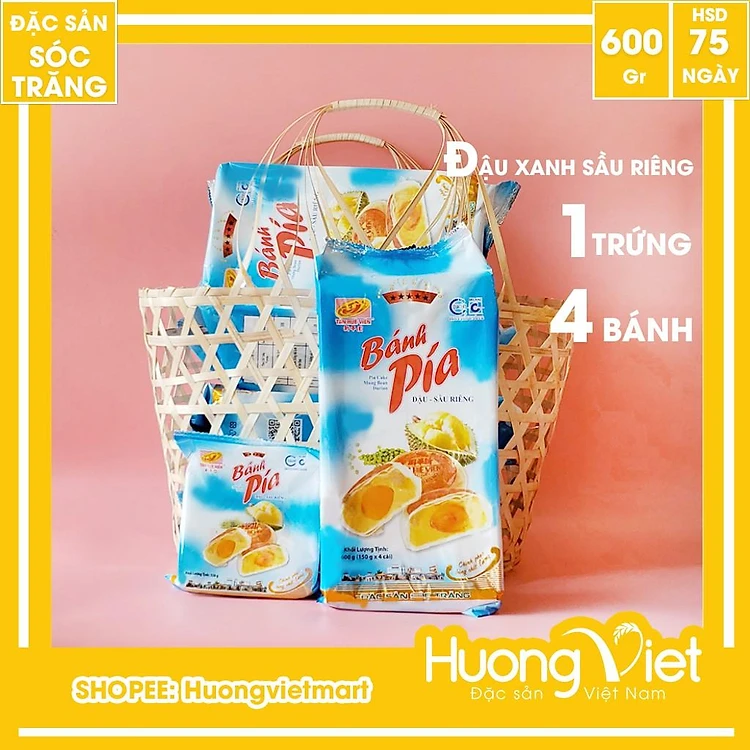 Bánh Pía Sóc Trăng đậu xanh sầu riêng trứng Tân Huê Viên 600g : gồm 4 bánh bên trong với bao bì riêng biệt từng chiếc giúp bảo quản bánh tốt hơn, tiện lợi và vệ sinh hơn