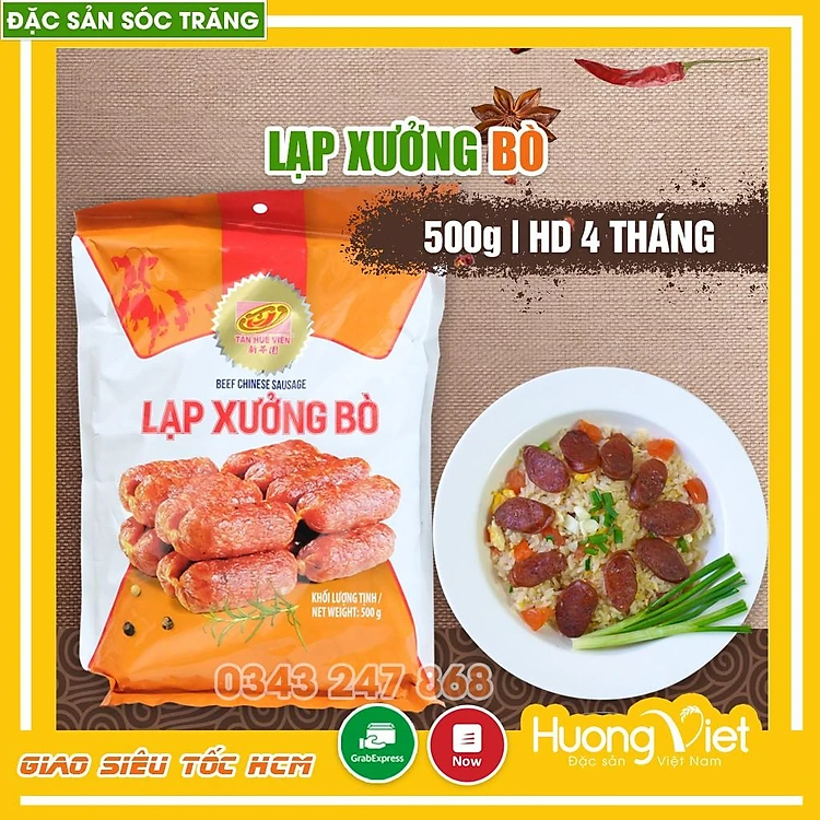 Món lạp xường bò của Tân Huê Viên được chế biến từ những miếng thịt bò tươi ngon. Những tảng thịt sau khi xay nhuyễn được ướp với tiêu, đường, muối, tỏi theo tỷ lệ phù hợp để tạo nên hương vị riêng. Khi thưởng thức, người dùng sẽ cảm nhận vị thơm giòn với phần vỏ dai dai, sần sật cùng thịt bò băm đậm đà, và hương thơm của các gia vị kích thích vị giác.