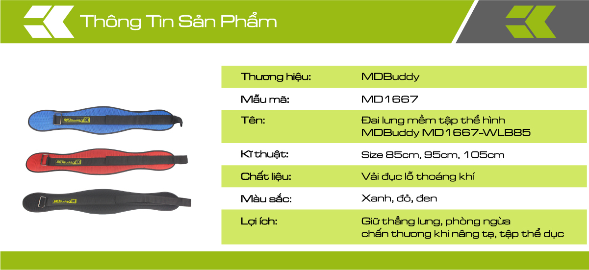 Đai lưng mềm tập thể hình, tập gym MDBuddy MD1667 giúp bạn giữ thẳng lưng, tránh sai lệch nguy hiểm. Giảm tác động lực lên cột sống, các đốt xương. Giữ lưng luôn thẳng phòng ngừa chấn thương. Không những thế chiếc đai lưng này còn giúp hỗ trợ rất tốt cho người đang phục hồi sau phẫu thuật, người già phòng tránh loãng xương, người phải ngồi nhiều: Lái xe, văn phòng,…, khuyên dùng bởi các bác sĩ chỉnh hình