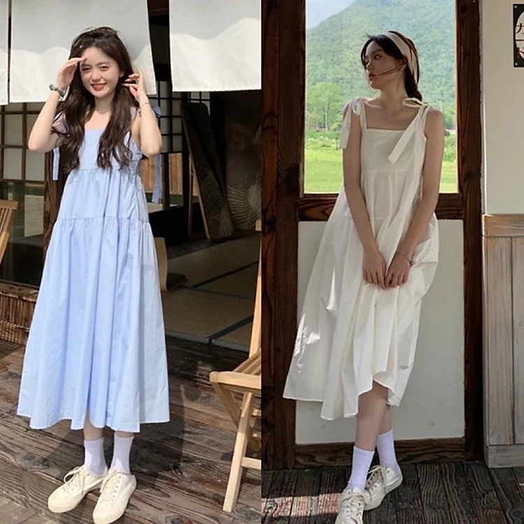 Đầm 2 dây buộc vai - váy babydoll 2 dây thô thắt nơ 4 màu