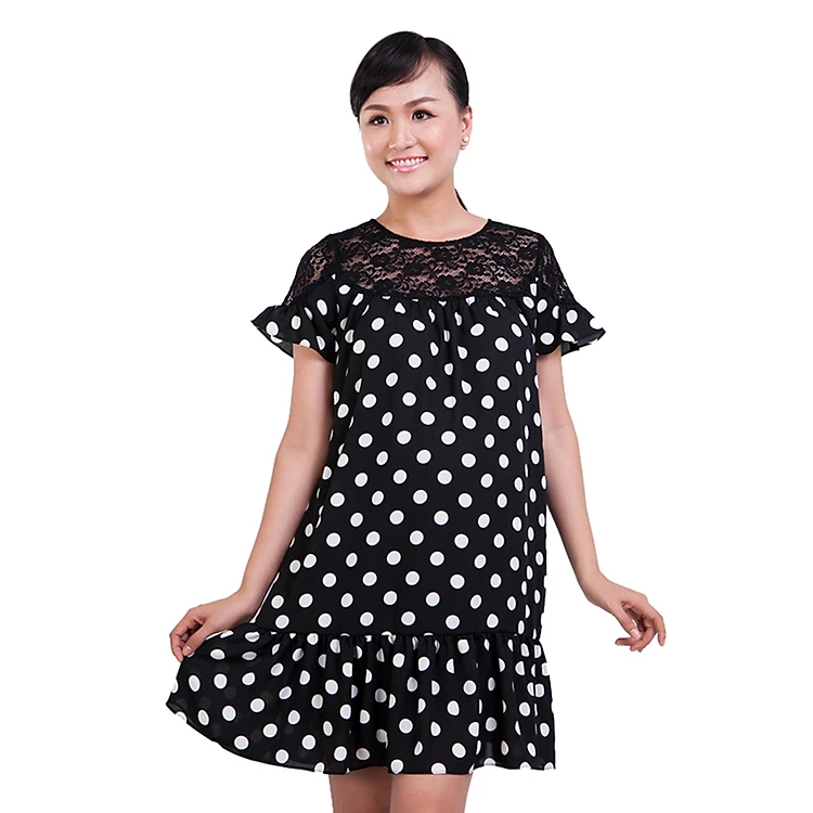 Đầm Bầu Cổ Phối Ren Hoa AnnaNina 504921 Họa Tiết Chấm Bi - Đen được yêu thích nhờ họa tiết chấm bi xinh xắn, mang đến cho mẹ bầu vẻ đẹp hiện đại, hợp xu hướng. Thiết kế cổ tròn, tay ngắn trẻ trung, phần cổ được tạo điểm nhấn nhờ vào phần phối ren hoa đầy tinh tế. Form đầm xòe, lai đầm may xếp ply tạo điểm nhấn thu hút. Sắc đen trung tính, không gây khó khăn trong việc phối hợp trang phục.
