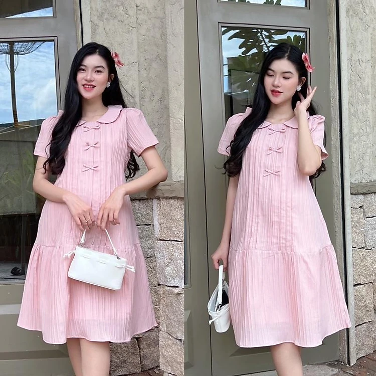 Đầm bầu cổ sen đính nơ dễ thương form đuôi cá gọn dáng, thanh lịch chất xốp Hàn Váy bầu dễ thương