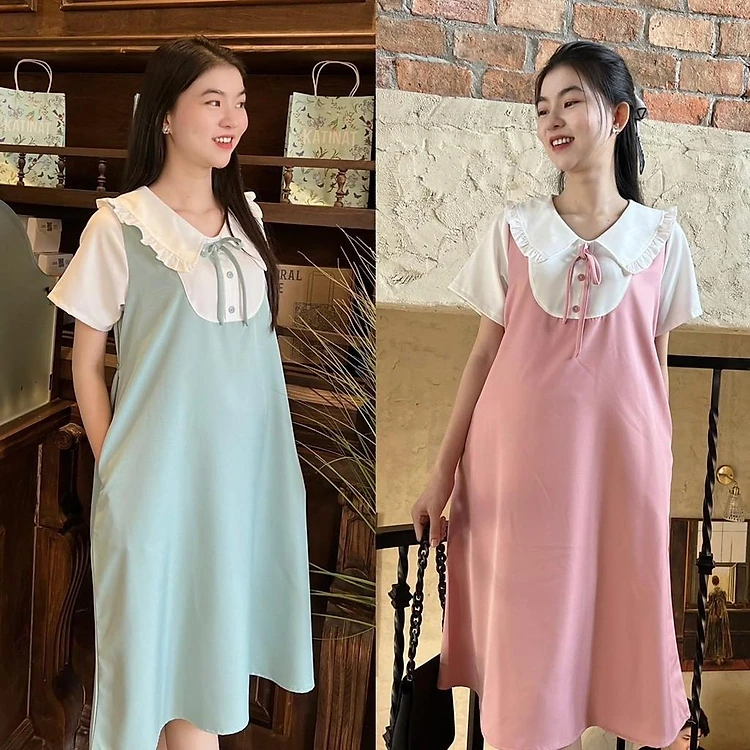 Đầm bầu giả yếm cổ sen bèo form suông công sở cotton lạnh mặc mát mẻ, trẻ trung