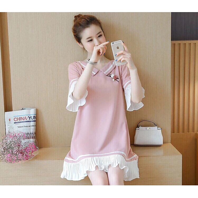 Kiểu dáng: đầm suông form rộng, cổ peterpan, tay lỡ ống loe, viền bèo dập li lai đầm và tay
