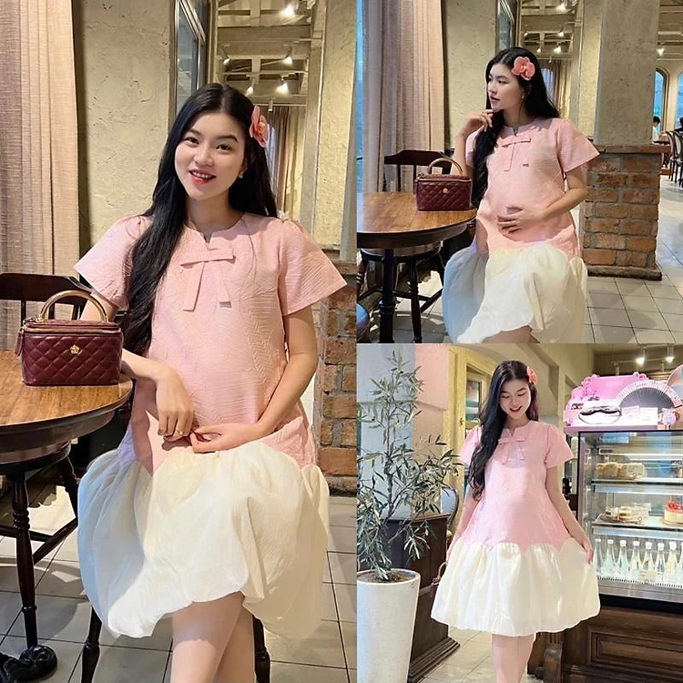 Đầm bầu tiểu thư vải gấm lụa gân 3D thanh lịch, trong trẻo cho mẹ bầu