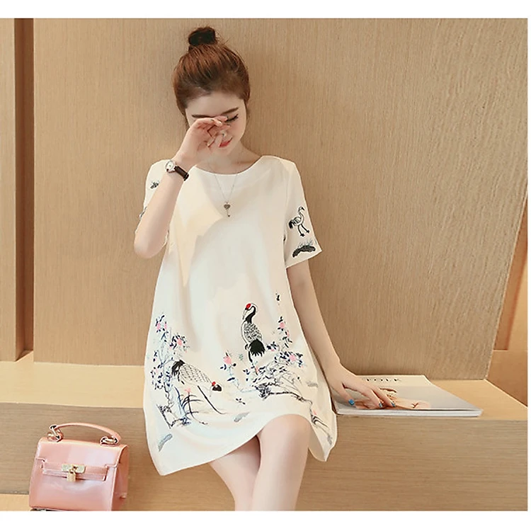 Kiểu dáng: đầm form rộng chữ A, tay ngắn, in nhiệt chim hạc