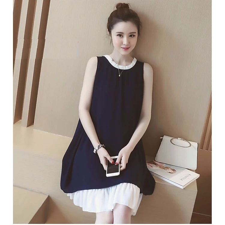 Kiểu dáng: đầm suông rộng chữ A, 2 lớp, phối bèo cổ và viền lai, sát nách