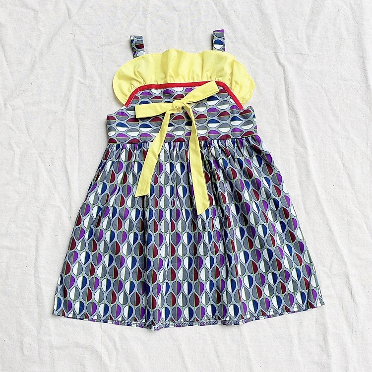 Đầm bé gái hai dây nơ vàng bi tím và lá xám