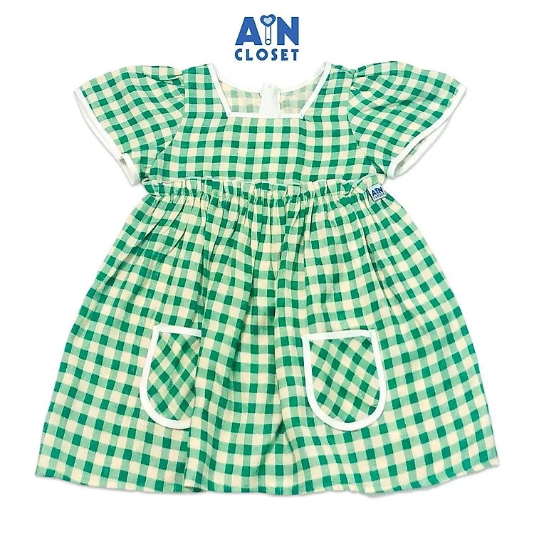 Đầm bé gái họa tiết Caro xanh lá đũi xốp - AICDBGCS3S6G - AIN Closet