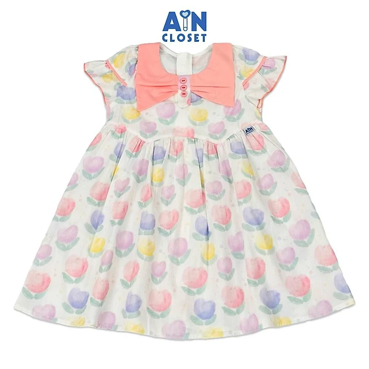 Đầm bé gái họa tiết Đóa Tulip cổ nơ hồng cotton - AICDBGW1XQHI - AIN Closet