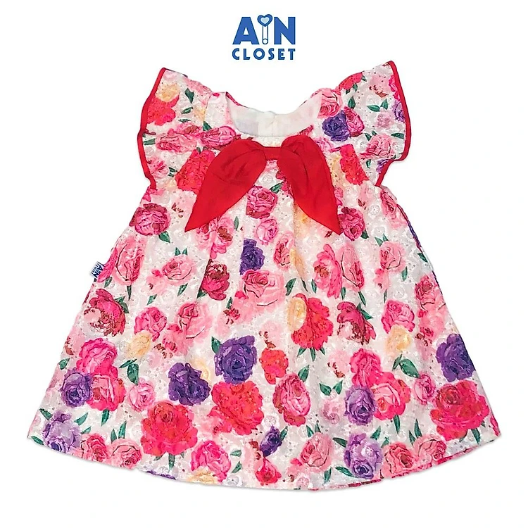 Đầm bé gái họa tiết Hoa hồng nơ đỏ voan thêu - AICDBGXPDSMA - AIN Closet