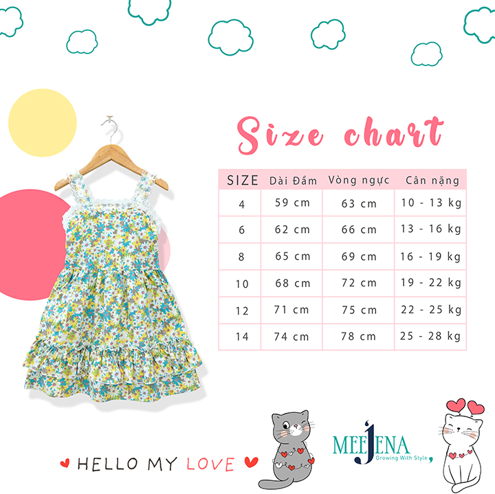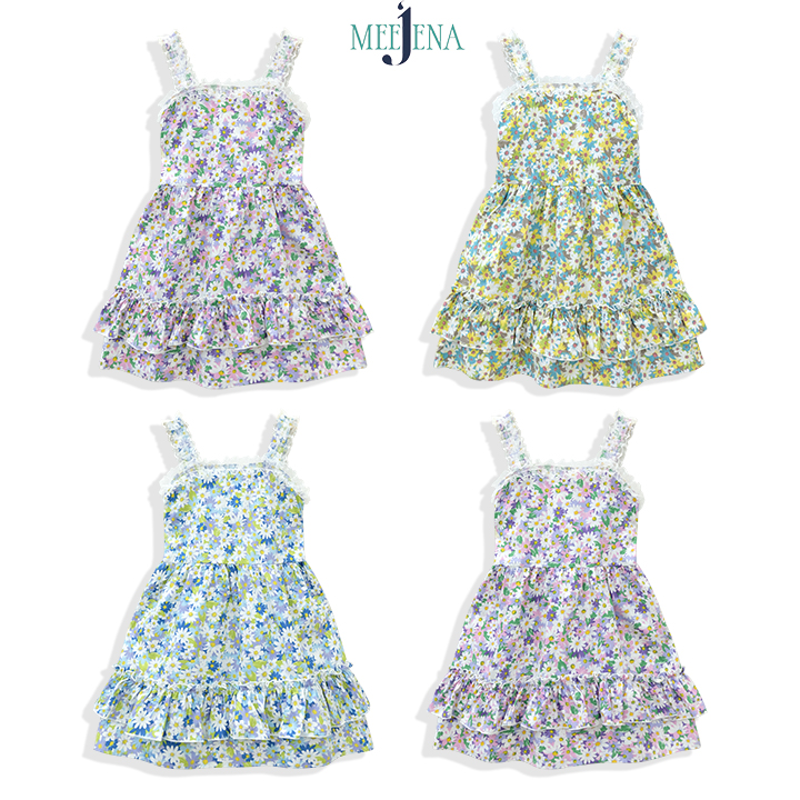 Đầm Bé Gái Kate Sát Nách 2 tầng tùng nhún phối ren MEEJENA 1843, từ 10- 28 kg, Vải Kate Hoa Cúc siêu dễ thương -1843