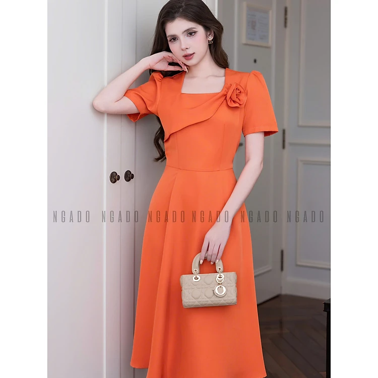 Đầm cam phối hoa NGADO , đầm nữ , đầm công sở , dự tiệc