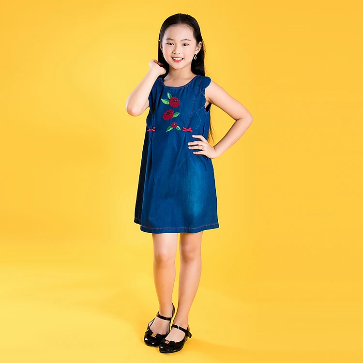 - Đầm Chữ A Bé Gái V.T.A.Kids 28061022 Xanh Jean Nhạt được may từ chất liệu chính 100% cotton mềm mại và mịn đẹp nên sản phẩm rất thân thiện với làn da nhạy cảm của bé.