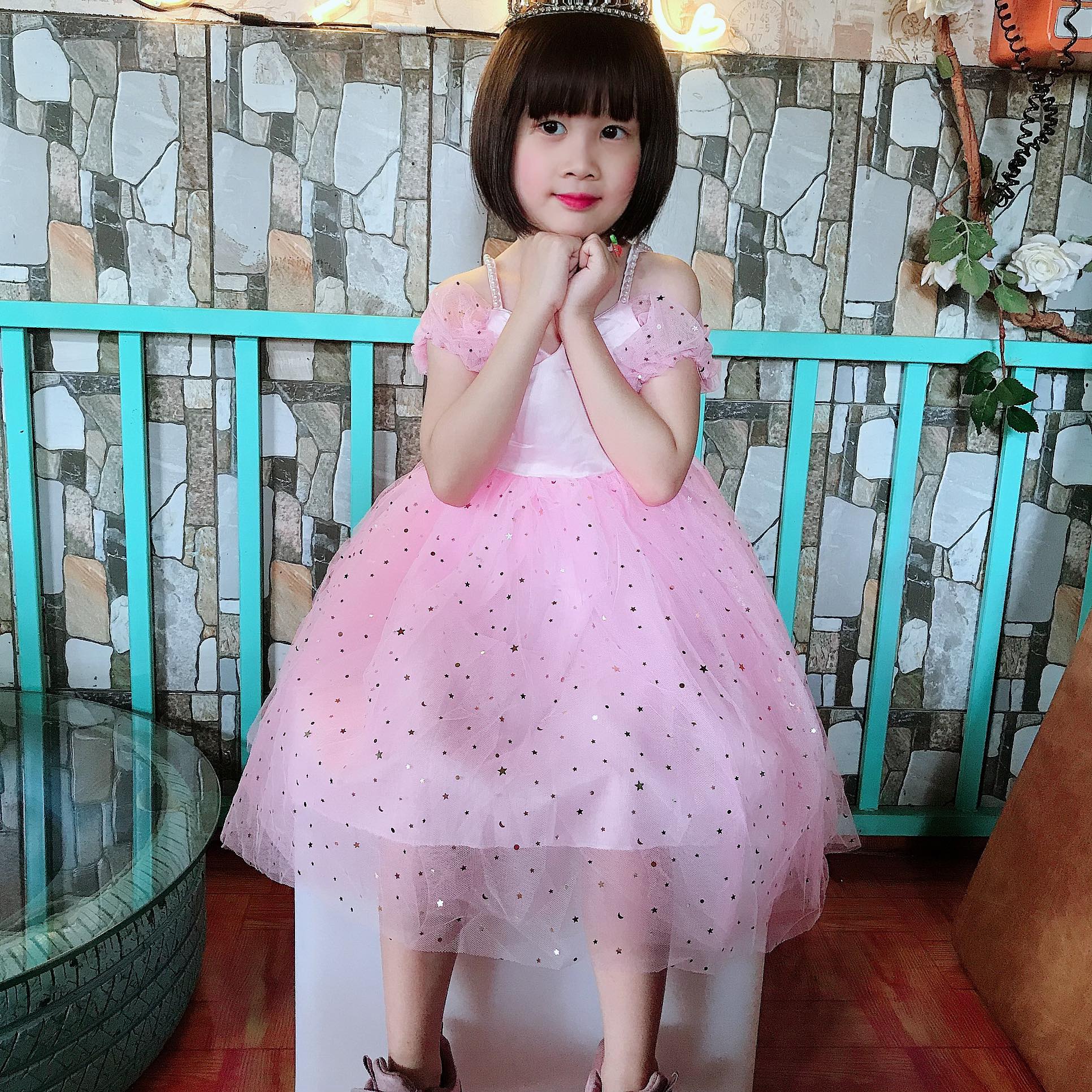- Váy công chúa kiểu tay rớt vai, 2 dây đính hạt, chân váy xòe 4 lớp.