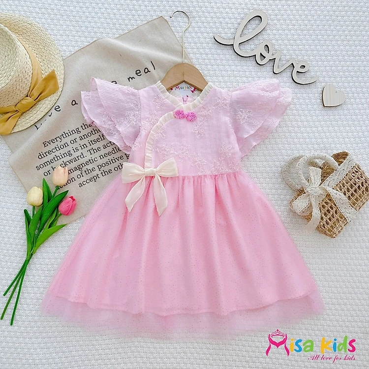Đầm công chúa màu trắng hồng cho bé gái cổ sườn xám cách tân từ 12-35kg hàng thiết kế cao cấp