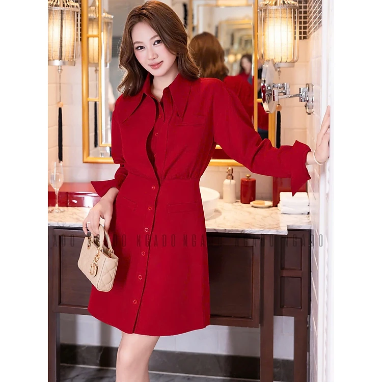 Đầm đỏ cổ sơ mi NGADO , đầm sơ mi , đầm dự tiệc , công sở