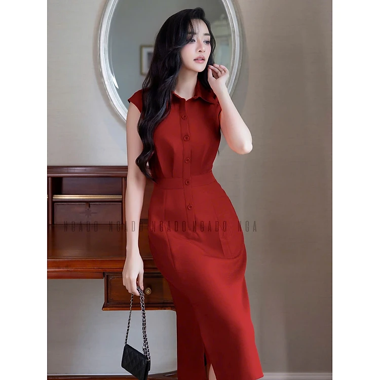 Đầm đỏ eo xếp ly NGADO , đầm kiểu Nữ , đầm công sở , dự tiệc