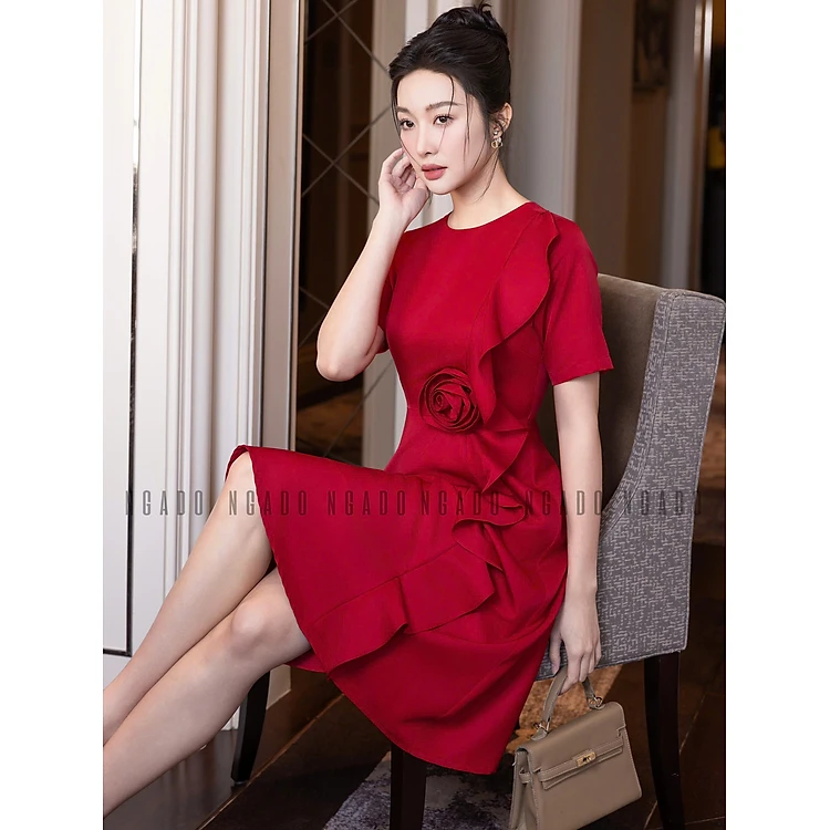Đầm đỏ phối bèo NGADO , đầm kiểu Nữ , đầm công sở , dự tiệc