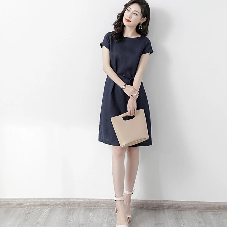 Đầm đũi nữ dáng suông cổ tròn ngắn tay, eo có dây thắt thiết kế đơn giản trẻ trung Haint Boutique