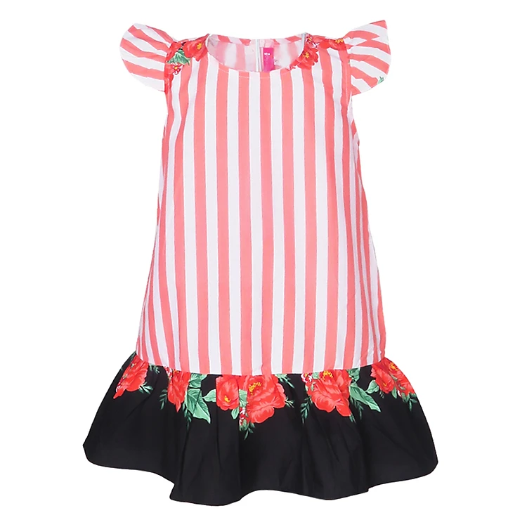 - Trang trí họa tiết sọc xéo và họa tiết hoa ở cổ áo, chân đầm với màu sắc đẹp mắt cho các bé phong cách nhẹ nhàng, ưa nhìn hơn.