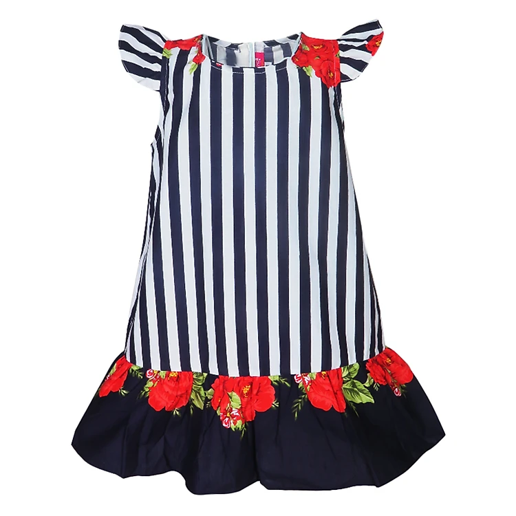 - Trang trí họa tiết sọc xéo và họa tiết hoa ở cổ áo, chân đầm với màu sắc đẹp mắt cho các bé phong cách nhẹ nhàng, ưa nhìn hơn.