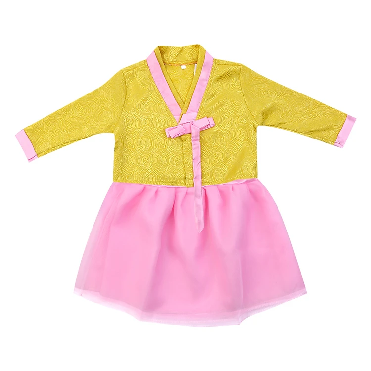 - Kiểu dáng áo hanbok truyền thống của Hàn Quốc được may từ vải gấm mềm mại, thấm hút mồ hôi tốt, cùng đầm 2 dây phi lụa phối váy ren chất liệu này không kích ứng da bé nên tuyệt đối an toàn. Ngoài ra, dễ giặt sạch và khô nhanh tiết kiệm thời gian cho mẹ.