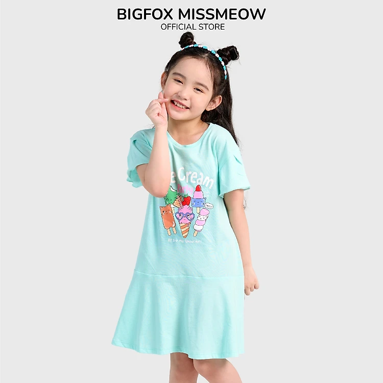 Đầm Hè Cho Bé Gái Miss Meow Tới Size Đại. Váy Cotton Thun Trẻ Em Bèo Gấu In Hình Ice Cream 3-11 Tuổi