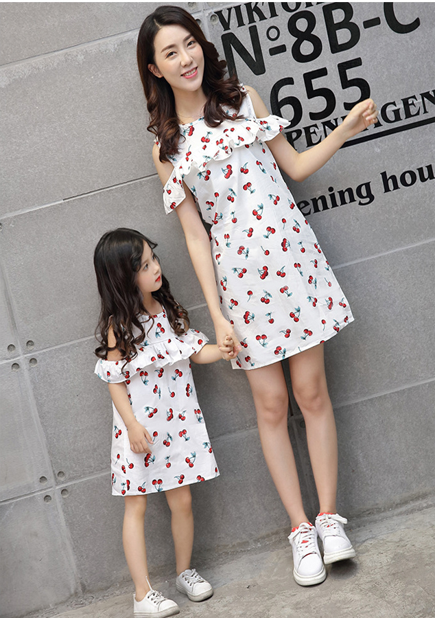 Đầm đôi cho mẹ và bé với kiểu dáng hở vai bèo , in trái cây bắt mắt