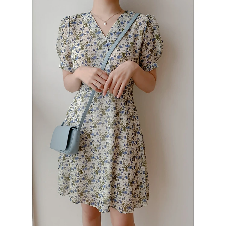 Đầm hoa cổ V tay bồng BYANTY DRESS
