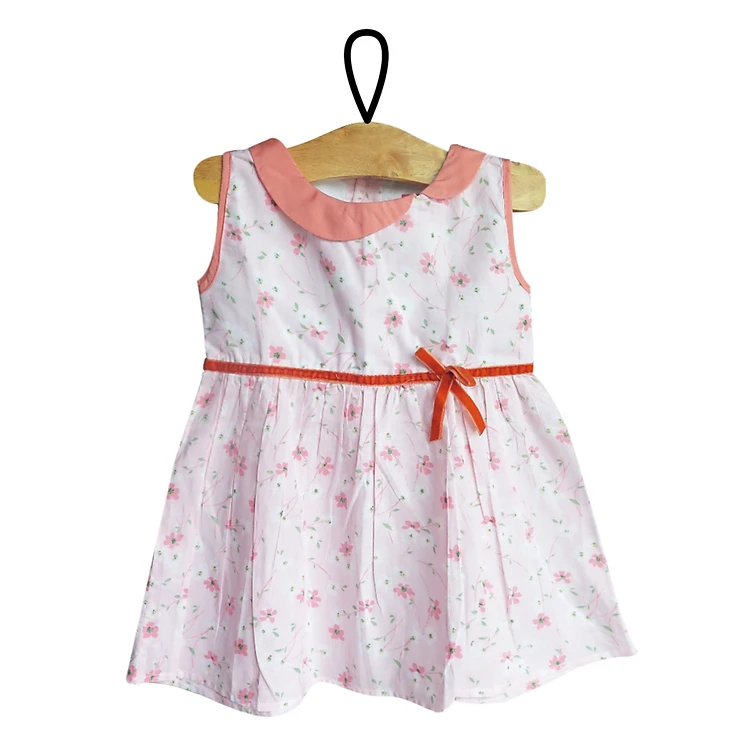- Áo sát nách, cổ cánh sen lệch về một bên tạo điểm nhấn, phần váy xòe nhẹ giúp bé trở nên xinh xắn.