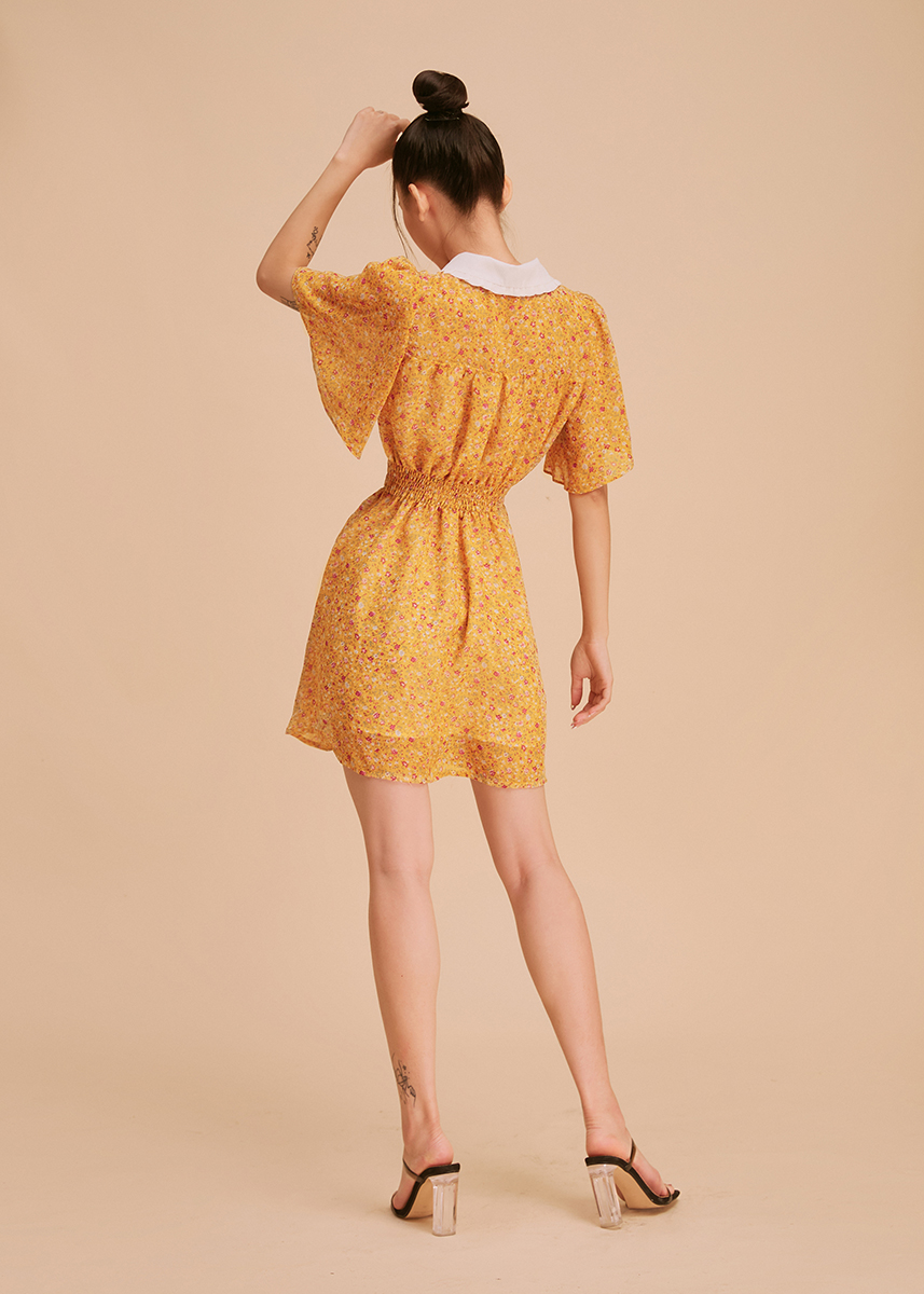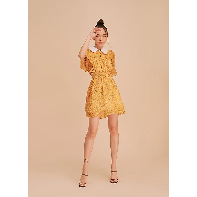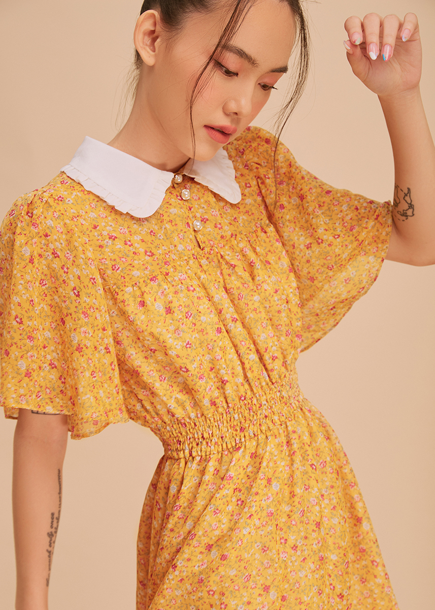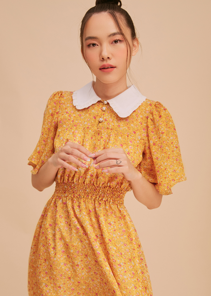 Đầm họa tiết hoa vàng nhún eo MAYBI - Caff Length Print Dress