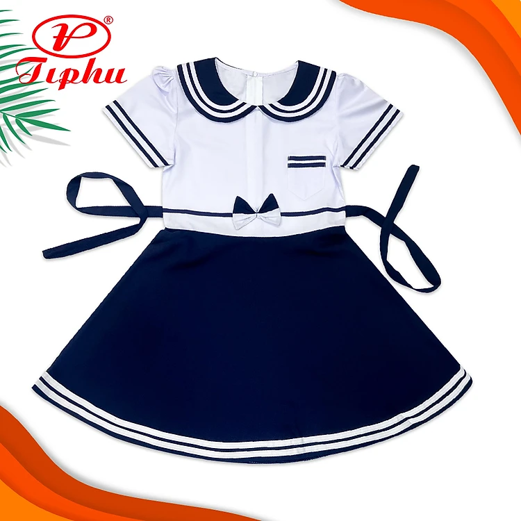 Đầm học sinh cấp 1, cổ viền lính thủy dễ thương, đồng phục bé gái tay phồng, dây cột nơ phía sau, có size lớn đến 60kg