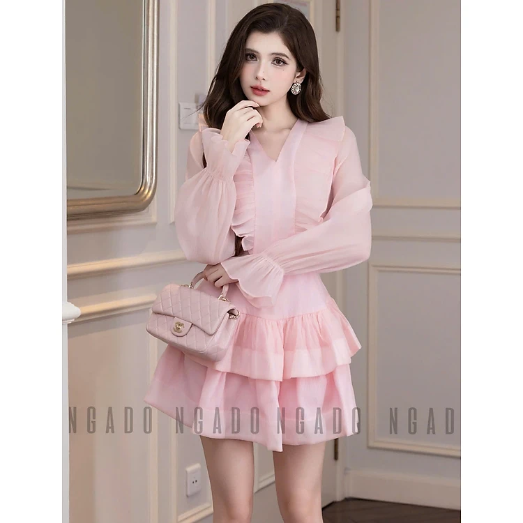 Đầm hồng tay voan NGADO , đầm voan , đầm nữ , đầm dự tệc, dạo phố