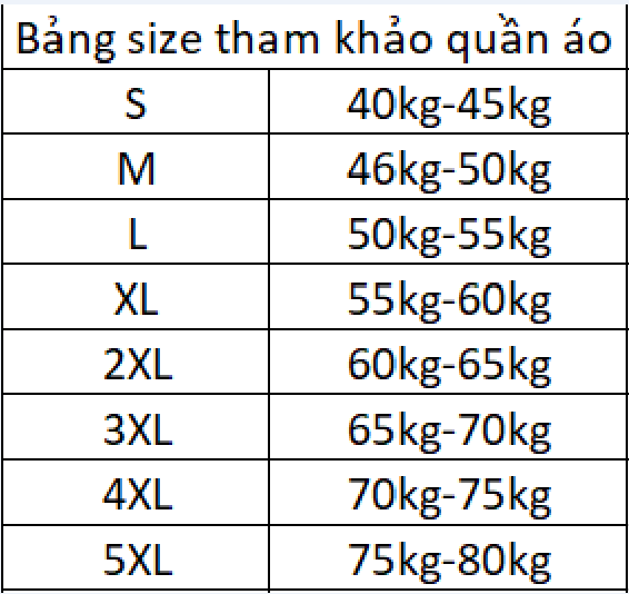 Bảng size tham khảo: