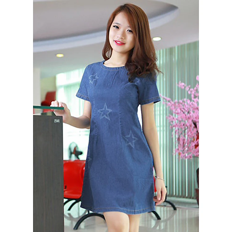 Đầm Jean Nữ Cổ Tròn Wash Ngôi Sao Duyên Dáng