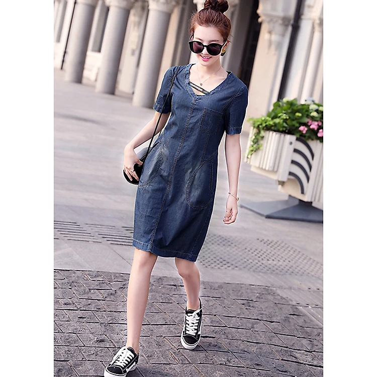 Đầm Jean Nữ Ngắn Tay Phối Dây Chéo Ngực