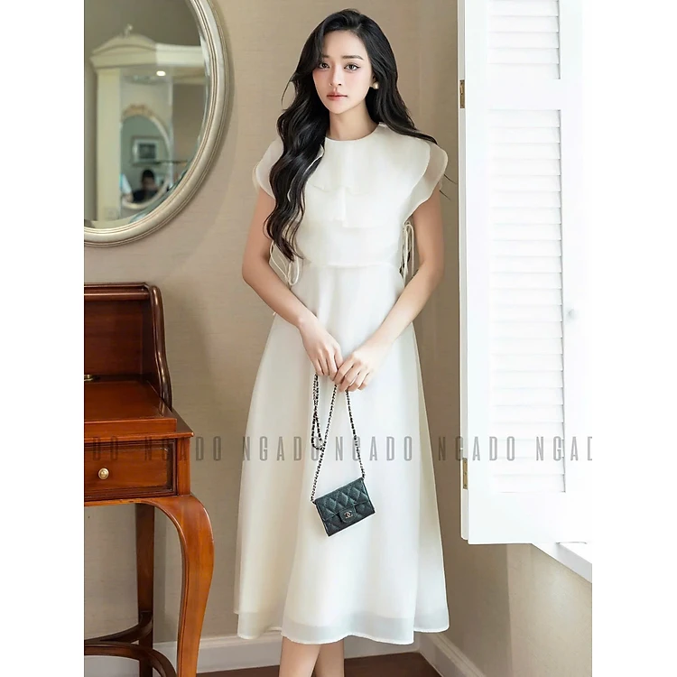 Đầm kem cổ xếp tầng NGADO , đầm xòe