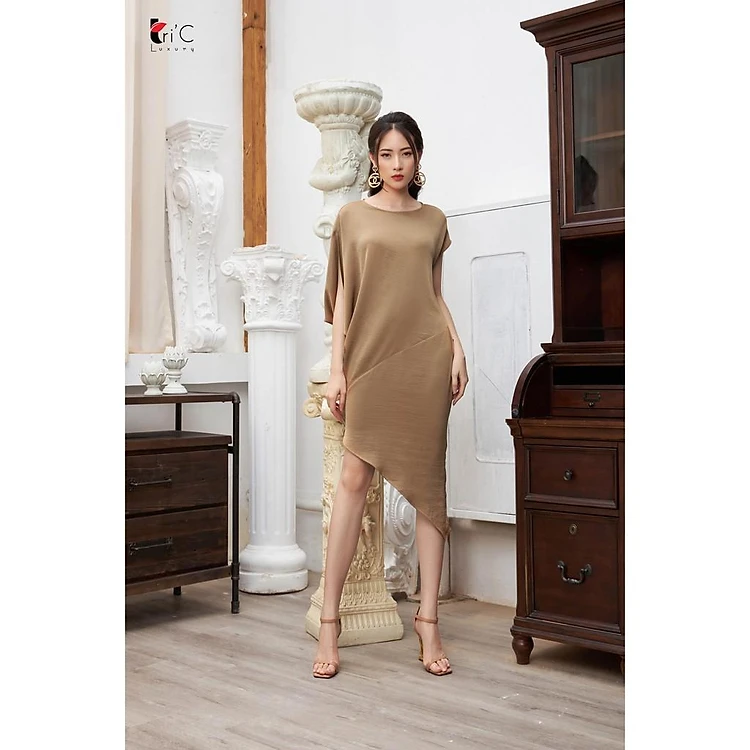 Đầm lệch thân Tri'C Luxury tay chờm gấu xéo Nâu tây A20820