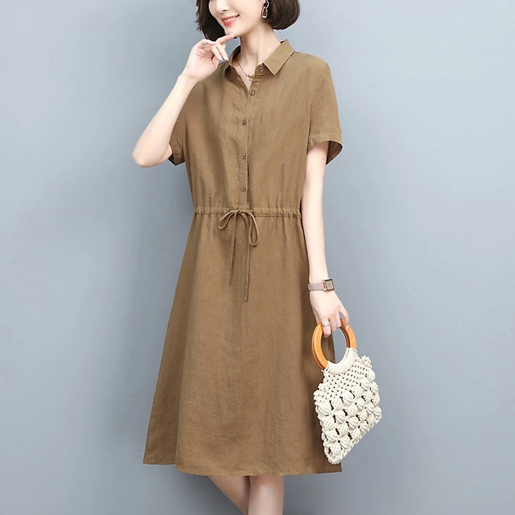 Đầm linen nữ cổ sơ mi ngắn tay kèm dây thát eo, thời trang công sở cho nữ đi làm Haint Boutique