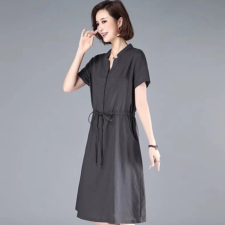 Đầm Linen nữ dáng suông rút eo, Váy linen nữ công sở thiết kế cổ tàu ngắn tay thời trang nữ Haint Boutique